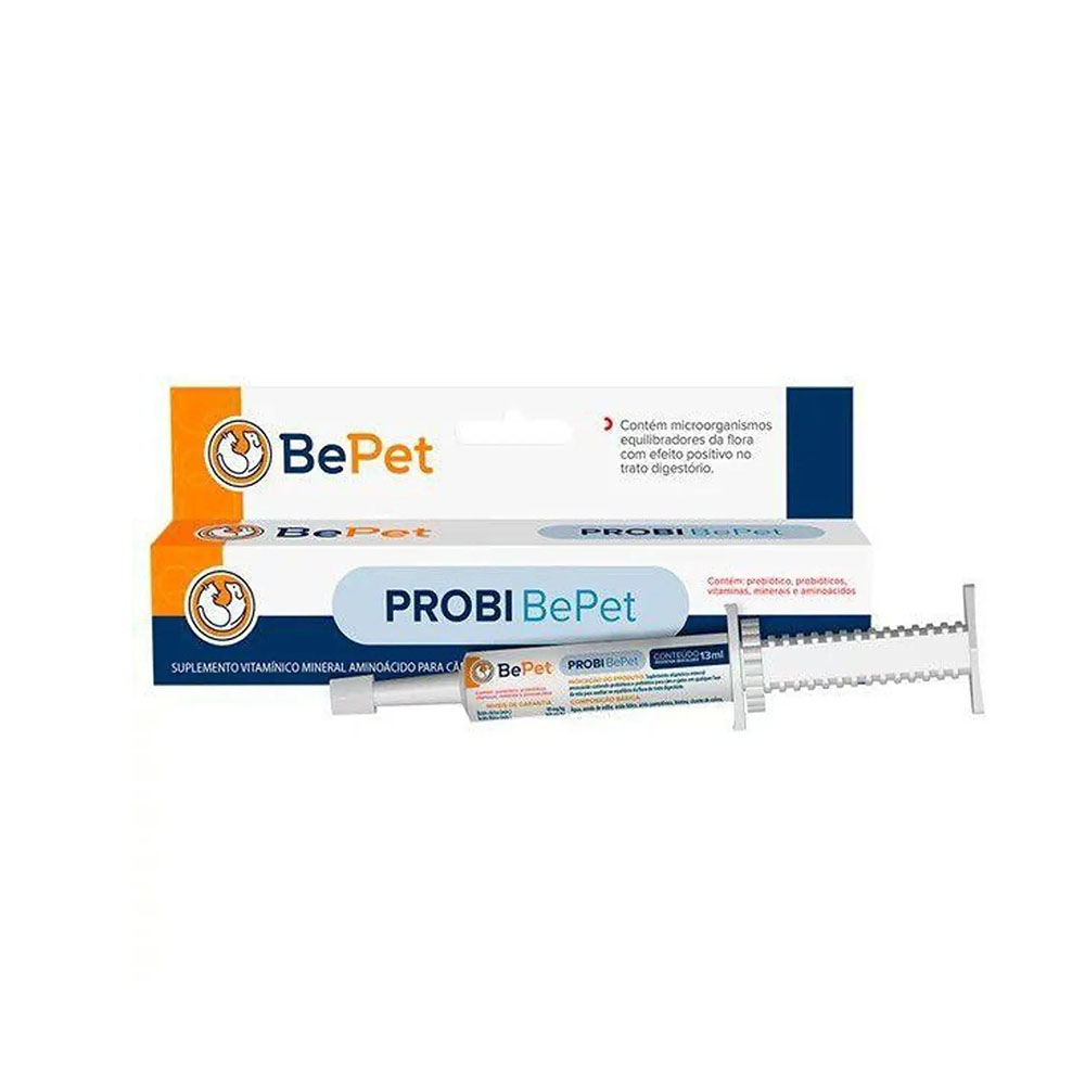 Probi Bepet 13ml é um suplemento vitamínico, mineral e probiótico para cães e gatos, vendido em seringa de 13ml, que contém aminoácidos, prebióticos e vitaminas para equilibrar a flora intestinal, auxiliar na digestão, fortalecer a imunidade e ajudar na recuperação após tratamentos medicamentosos ou em fases de estresse, sendo seguro para todas as idades e fácil de administrar via oral, segundo a dosagem recomendada para o peso do pet.